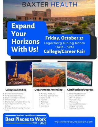 September 30, 2022 – Baxter Health will be hosting a College/Career Fair at the main hospital campus in Mountain Home on Friday, October 21 in the ...